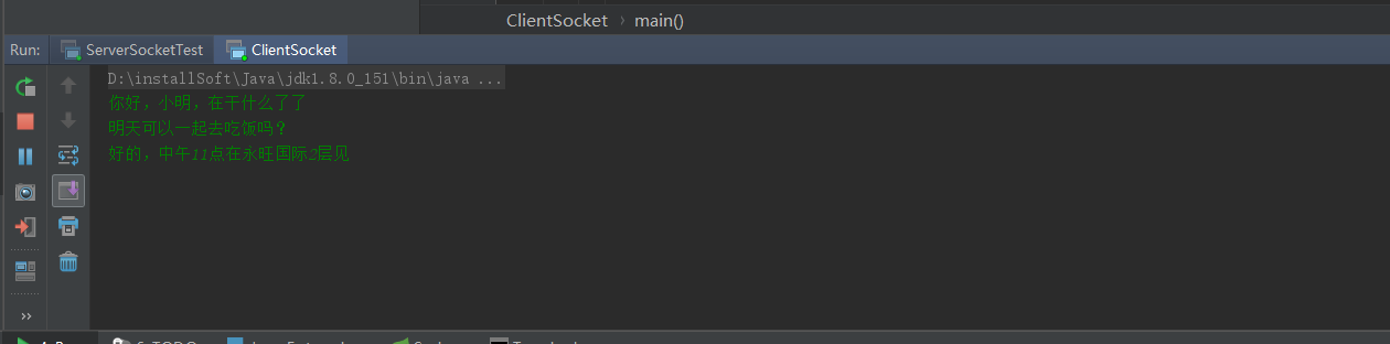 在上面的示例中,客户端端在循环发送数据时候,每发送一行,添加一个换行标识“\n”标识,在告诉服务端我数据已经发送完成了。而服务端在读取客户数据时,通过while ((str = bufferedReader.readLine())!=null)去判断是否读到了流的结尾,负责服务端将会一直阻塞在哪里,等待客户端的输入。