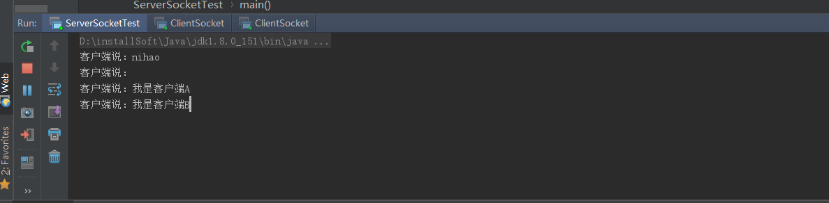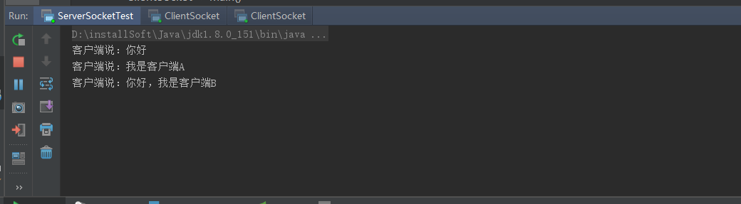 通过这里我们可以发现,客户端A和客户端B同时连接到服务端后,都可以和服务端进行通信,也不会出现前面讲到使用while(true)时候客户端A连接时客户端B不能与服务端进行交互的情况。在这里我们看到,主要是通过服务端的 new Thread(new Runnable() {}实现的,每一个客户端连接进来后,服务端都会单独起个一线程,与客户端进行数据交互,这样就保证了每个客户端处理的数据是单独的,不会出现相互阻塞的情况,这样就基本是实现了QQ程序的基本聊天原理。