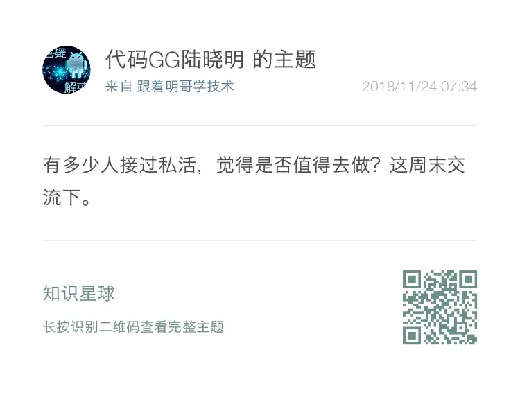 接下来我还想谈一谈技术意外的私活儿。这其实很广泛了,比如公众号,小专栏,gitchat,直播...。对于私活儿,我个人的理解是除了你的主职工作以外的所有可以给你提供额外收入的劳动都叫私活儿。