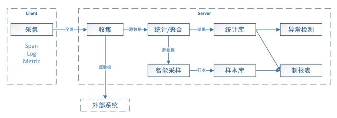 在设计上我们让客户端尽量的简单,只做好采集这一件事情就可以了。因此放弃了一些有诱惑力的想法,包括在客户端进行聚合、配置下达、字节码修改等。事实证明这样带来了很多好处:客户端更不易出错且设计稳定不易变化。出错和易变是客户最不愿意接受的;整个客户端的逻辑很少且容易理解,在开发跨语言客户端和用户自行扩展时都非常的容易;另外性能也很容易做到很高。