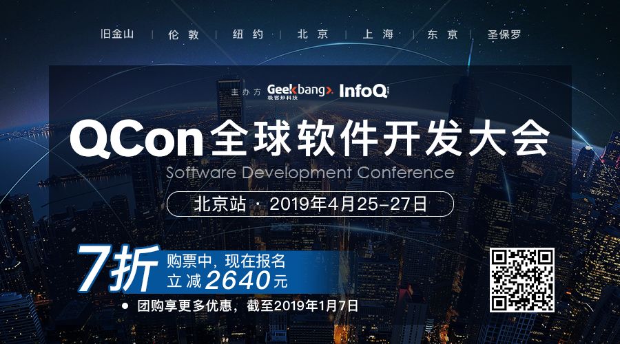 QCon 北京 2019 现已全新起航,除了一些常规的专题设置外,新增了用户增长、智慧零售等当下热点话题,在技术深度和广度上不断延展。目前大会 7 折报名中,立减 2640 元。识别二维码了解 QCon 十周年的精心策划。