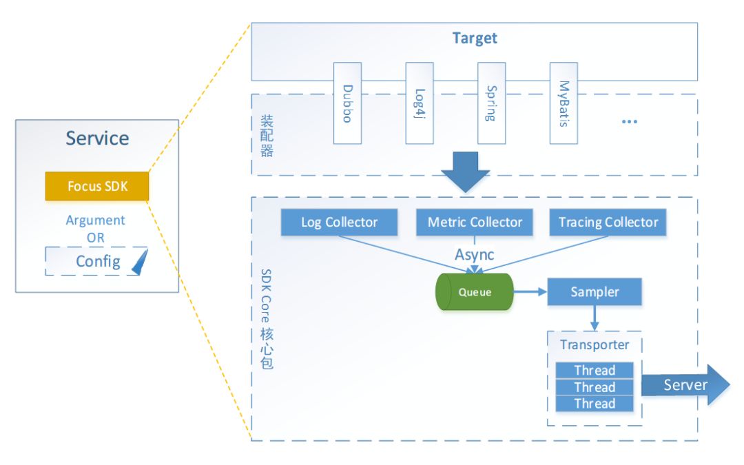 客户端设计Focus 客户端会一次性把全部需要的信息采集到,包括 Span、Log、Metric 和一些 Metadata。是一个一站式采集客户端。