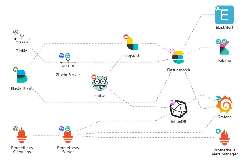 诞生背景开源社区在监控体系内各方向上均有成熟的产品贡献。和大多数公司一样,随手记最也选择基于开源产品来组建应用监控系统,并摸索实践了 1 年多的时间。直到架构发展到如下阶段: