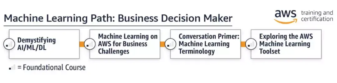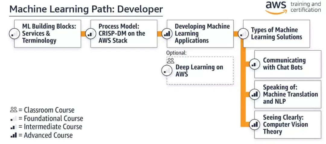 量身定制的学习路径:参加与自己特定 ML 目标和新学习路径相匹配的训练。亚马逊还创建了一条路径来帮助开发人员和数据科学家为新的 AWS ML 认证做准备。