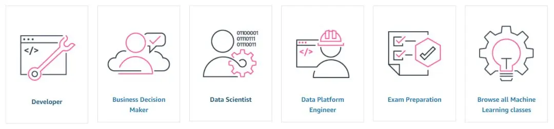 AWS 的机器学习课程主要有 5 条学习路径,其分别为开发者、企业决策者、数据科学家、数据平台工程师准备了四条学习路径,同时也为希望快速获得 AWS 认证的工程师提供「考试」路径,当然这会需要工程师本身有一定的功底。