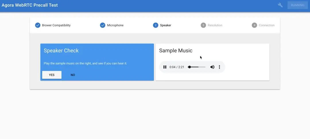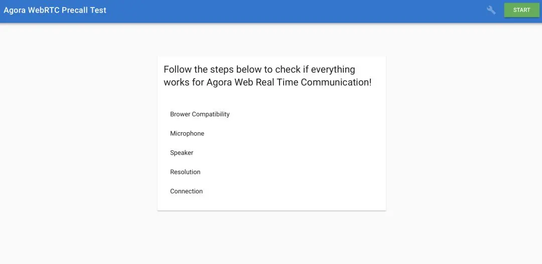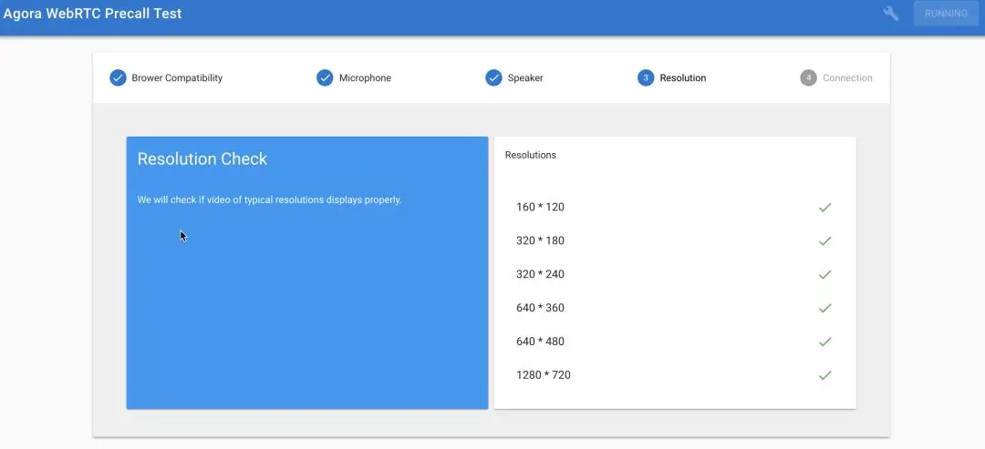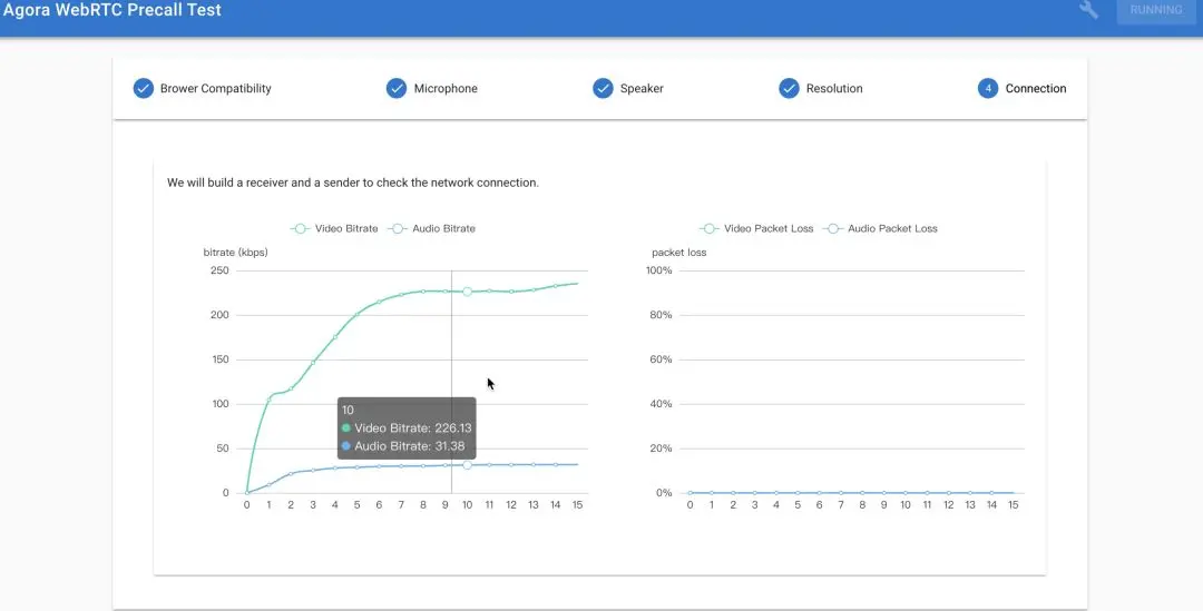 如果你是基于 WebRTC 开发应用的独立开发者,可以让你的用户通过这个 Web demo 地址测试以上项目。只不过,在测试“网络连接”这一项时,该工具是测试用户端与 Agora 服务端的网络连接状态与丢包情况,仅此测试项结果可能会与未集成 Agora SDK 的 WebRTC 应用的实际体验不同。