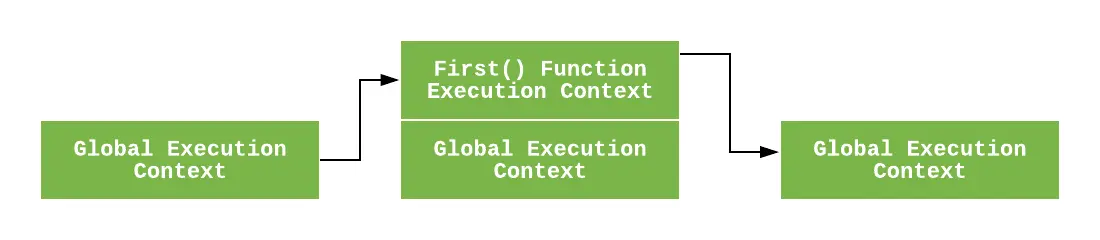 当以上代码执行时,JavaScript引擎会创建一个全局执行上下文来执行全局代码,然后当执行到调用first()函数时,它会为该函数创建一个新的执行上下文并且将其推送到执行堆栈的顶部。 所以,上面代码的执行堆栈就如下图那样: