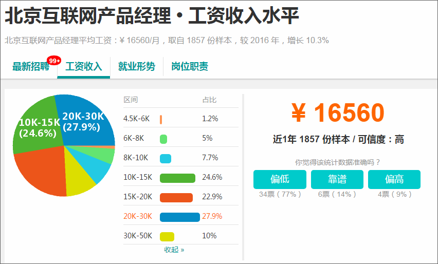 从上图表显示来看:在北京,互联网产品经理平均薪资是16560元/月,薪资区间在20K-30K的占了26.7%,而30K-50K占了6.2%,大约90%的产品经理薪资超过10K以上。