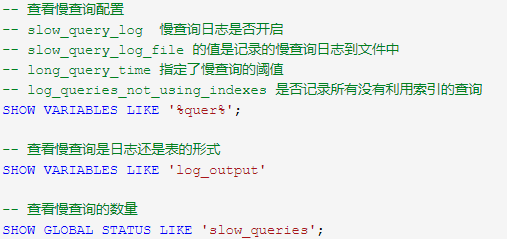 有时候如果线上请求超时,应该去关注下慢查询日志,慢查询的分析很简单,先找到慢查询日志文件的位置,然后利用mysqldumpslow去分析。查询慢查询日志信息可以直接通过执行SQL命令查看相关变量,常用的SQL如下: