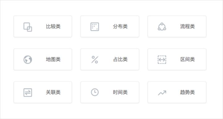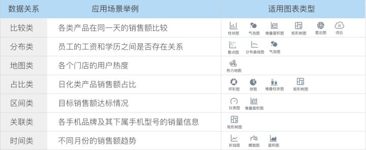 Ant v把数据关系分成了9个大类,当你确定了某个数据关系类型后,就可以根据该数据的使用场景查找出相对应的图表和使用建议,并在其中进行选择。