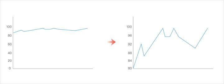 很多数据可视化工具里都有“数轴是否包括零”这一个选项,用户可通过这个功能来控制坐标轴的显示范围,例如下图,折线的波动范围比较小,走势起伏不明显,这时可以选择数据不从零开始,清晰地看出了折线的走势情况。当然,如果在平时的数据报告中,这样显示有夸大差异的嫌疑,不建议频繁使用。