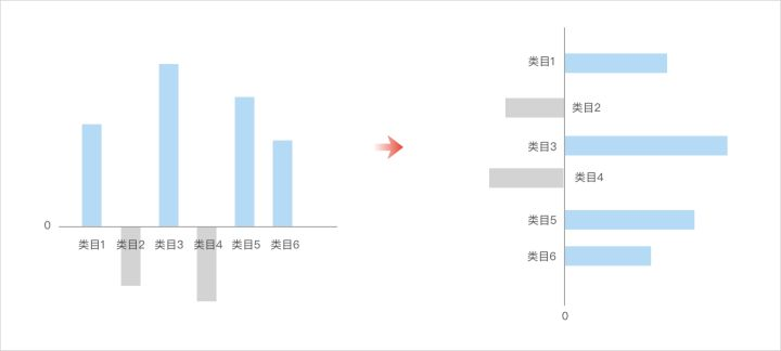 当一些数值有负数时,标签和柱条离得较远,不便于阅读,如果标签紧贴柱条,又会发生重叠,比较好的方式是标签根据柱条的方向分别显示在坐标轴的两侧。