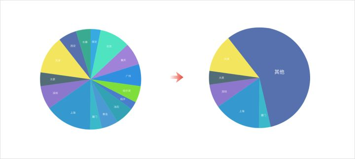 在做数据报告时,不管有多少数据项,为了完整和精确性,所有的内容都会显示出来,但在大屏中,如此满的数据展示,不但忽略了视觉体验,还会让用户抓不住重点,对于饼图来说,建议扇区个数不要超过5个,例如保留占比前5的扇区,剩下的非重点数据全部归到“其他”。