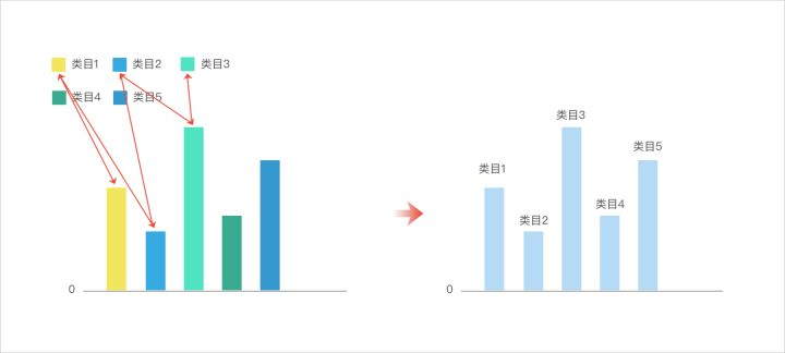 大屏的图表中应该尽量避免图例,图例会让用户不断在数据项和颜色块之间往返比对,耗费时间,还容易忘记重点,由于柱条个数经特殊处理后并不会很多,所以数据项名称可以直接标注。