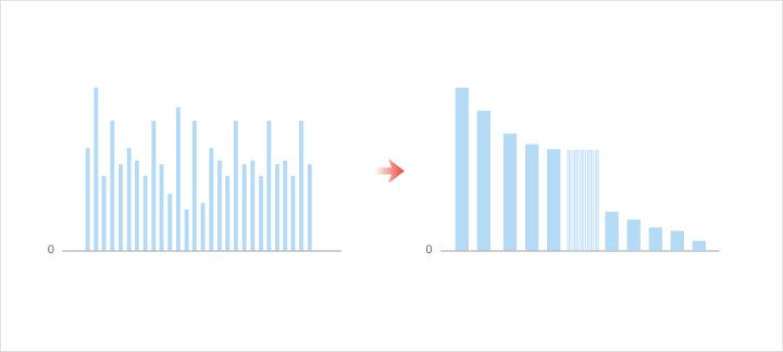 如果柱状图的数据项过多,展示时会过于密集,建议先把数据项按照数值大小排序,然后将中间用户可能不是最关心的柱条折叠起来,只保留前五和后五的数据项。