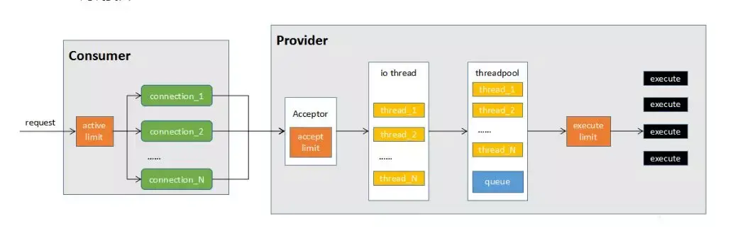 Provider处理请求时,统计方法维度的调用情况,如果并发数超过设置的最大值,则阻直接抛出异常。