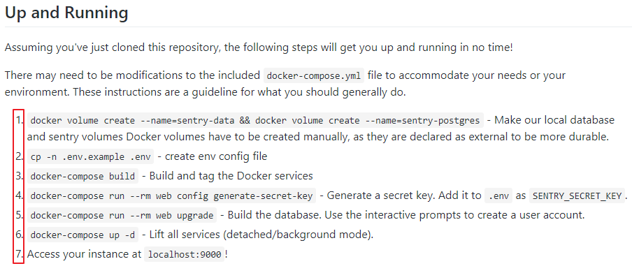 获取到本地之后,就可以根据他的README.md开始着手搭建了,也可以根据https://github.com/getsentry/onpremise里步骤进行安装。
