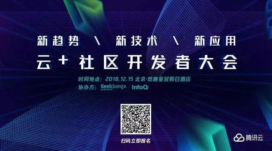 2018 年 12 月 15 日,由腾讯云主办,微信、腾讯 TEG、极客邦科技 协办的首届「腾讯云+社区开发者大会」将在北京举行。现场将围绕「新趋势·新技术·新应用」的主题设置 8 个主题演讲,并设置涵盖 AI 大数据、IoT、小程序、DevOps 等热门技术的四大分会场。