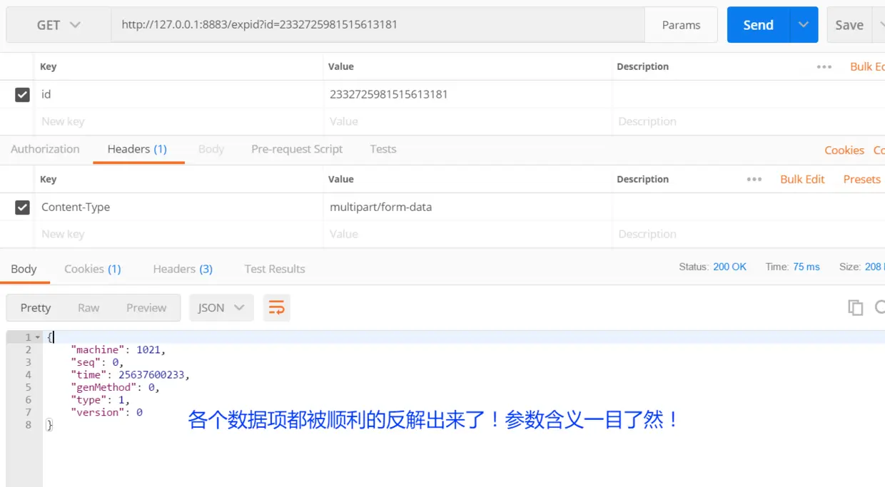 由于 Vesta生成的全局唯一流水号具有 可反解 的优良特性,因此我们可以先生成一个流水号,然后调用 expid接口来反解出流水号所代表的意义: