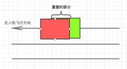 绿色块是我们在第一条航线中拍到的区域,红色块是我们第二条航线拍到的区域,他俩重叠的部分相对于他们自己来说就叫做旁向重叠率,旁向重叠率是影响航线规划间隔的唯一因素,我们需要通过重叠率来计算出飞行路径的间隔,当然,此处的重叠率也不能设置为100%,如果设置100%的话,那么红色块就会和绿色块重叠,也意味着第一条航线和第二条航线重叠,无人机也就只会在一条航线上来来回回的飞行。