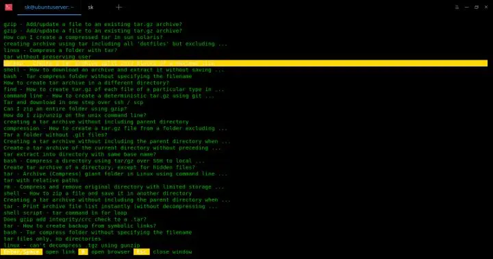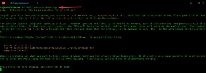 $ how2 <search-query>例如,我将搜索如何创建 tgz 存档。
