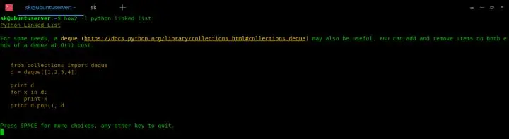 $ how2 -l python linked list要获得快速帮助,请输入: