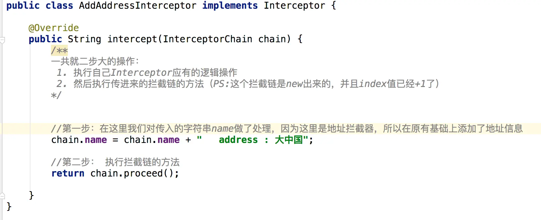 Interceptor只负责处理自己的业务功能,比如我们这里是填充地址和手机号码,然后自己的任务结束就会调用拦截器链条,执行链条接下去的任务,其他跟Interceptor无关。