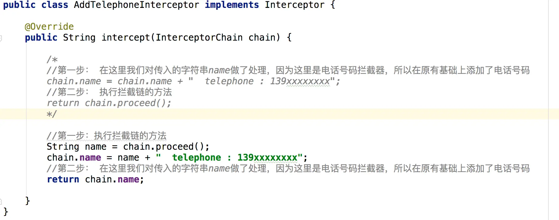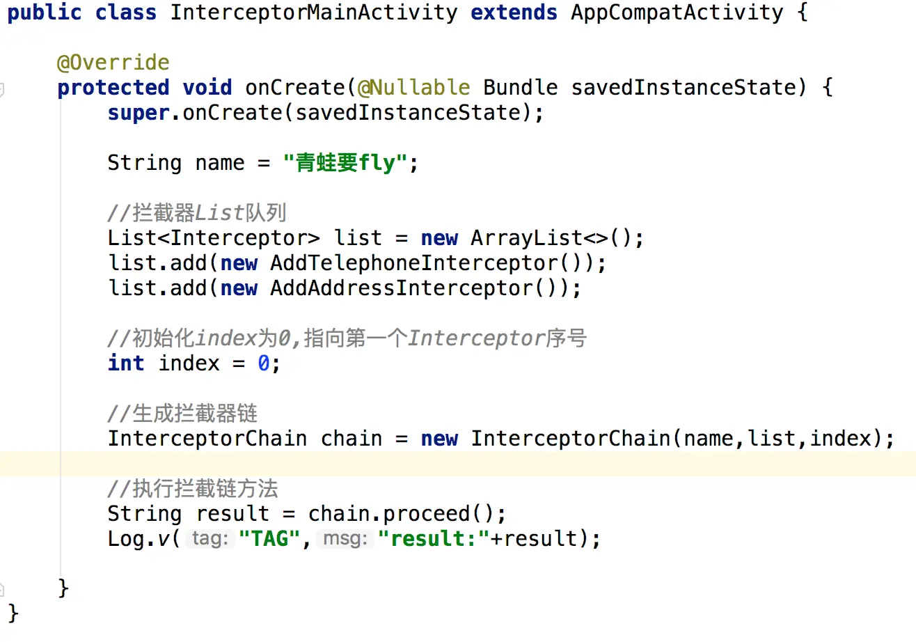 我的写法还是按照它的写法,写了二个Interceptor,一个用来填充地址AddAddressInterceptor,一个中来填充电话AddTelephoneInterceptor,然后也建立一个拦截链条InterceptorChain。这样我只需要传进去一个字符串,然后会自动按照每个拦截器的功能,自动帮我填充了地址和电话号码。