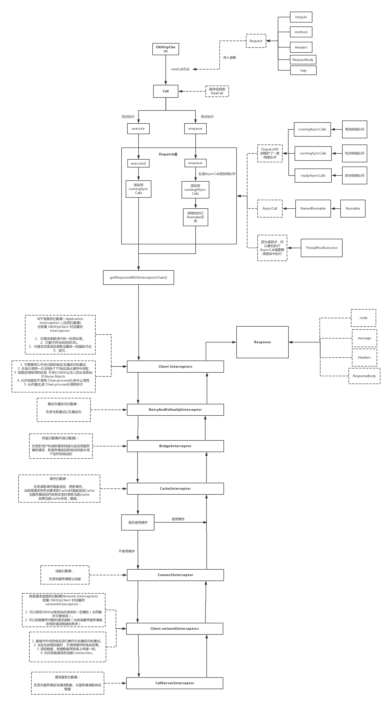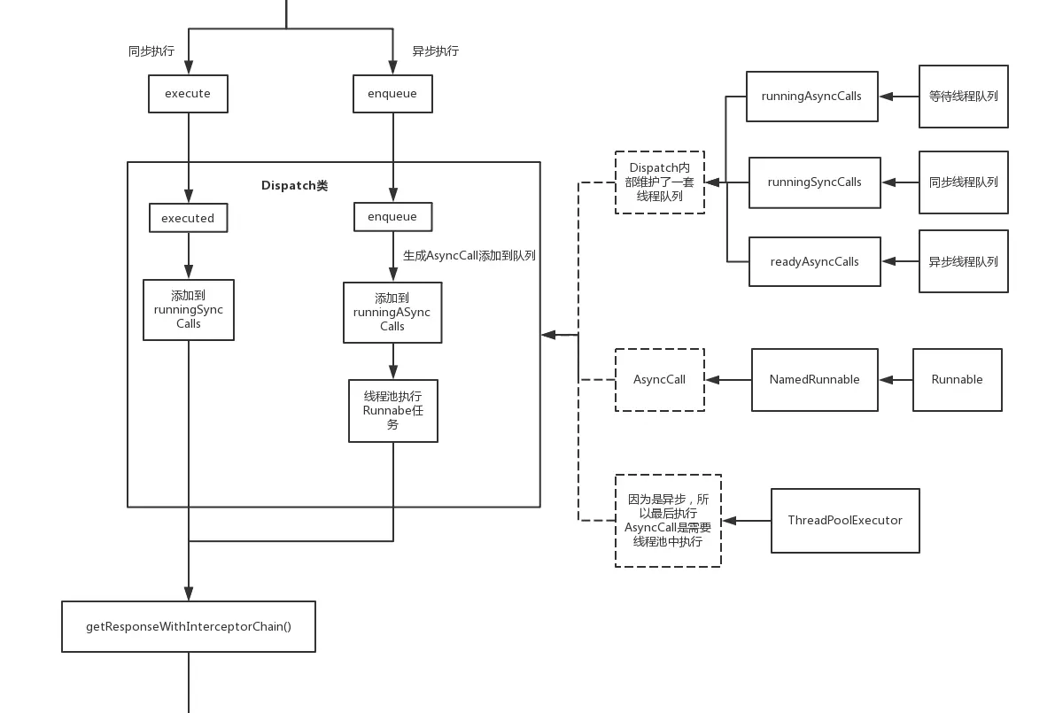 我们发现不管是异步还是同步,都是一样的三部曲:1.加入到Dispatcher里面的同步(或异步)队列,2.执行getResponseWithInterceptorChain方法,3.从Dispatcher里面的同步(或异步)队列移除。(只不过同步操作是直接运行了getResponseWithInterceptorChain方法,而异步是通过线程池执行Runnable再去执行getResponseWithInterceptorChain方法)