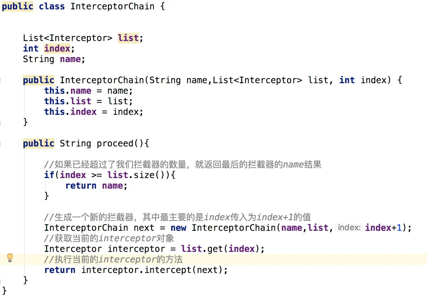 //'实例化了一个新的RealInterceptorChain对象,并且传入相同的拦截器List,只不过传入的index值+1'