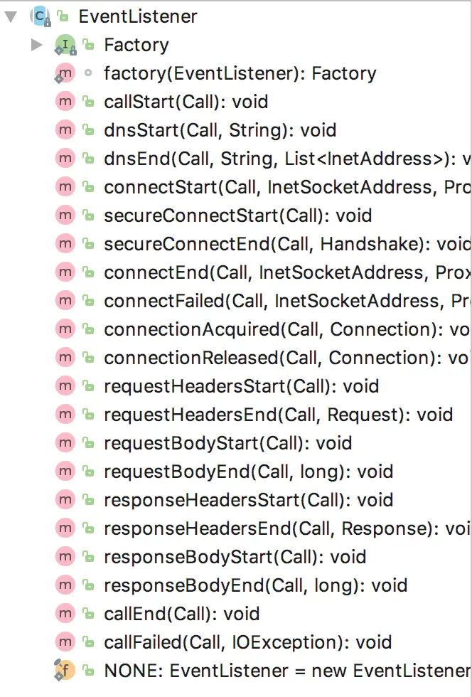 EventListener:指标事件的监听器。扩展此类以监视应用程序的HTTP调用的数量,大小和持续时间。所有start/connect/acquire事件最终都会收到匹配的end /release事件,要么成功(非null参数)要么失败(非null throwable)。每个事件对的第一个公共参数用于在并发或重复事件的情况下链接事件,例如dnsStart(call,domainName);和dnsEnd(call,domainName,inetAddressList); 我们可以看到一系列的xxxStart和xxxEnd方法: