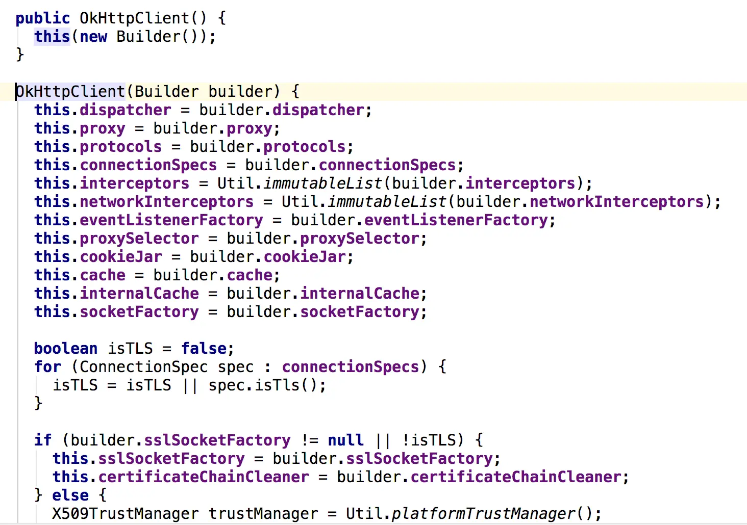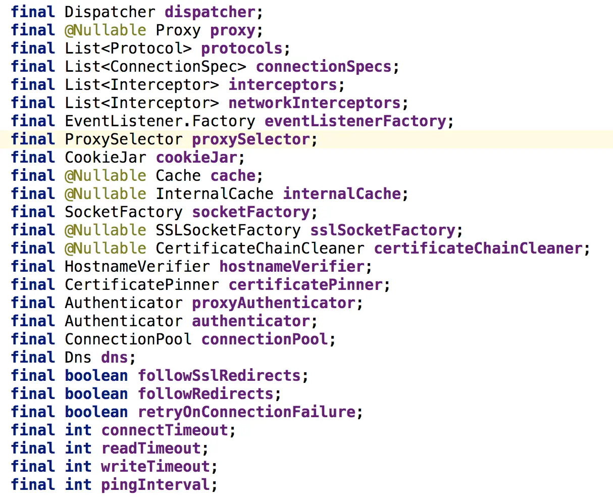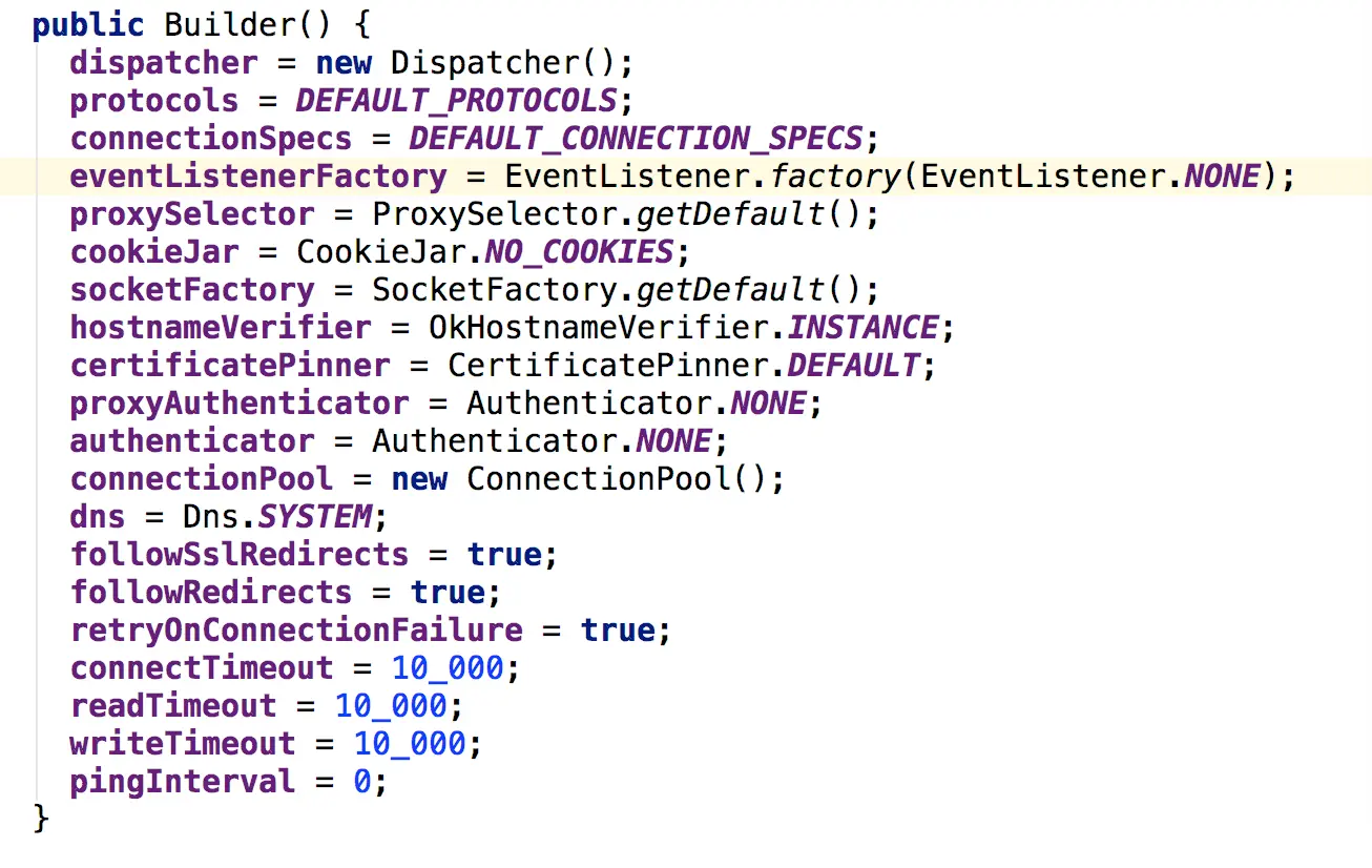 OkHttpClient除了空参数的构造函数,还有一个传入Builder的构造函数,而我们的new OkHttpClient()最终也是调用了传入Builder的构造函数,只不过传入默认的Builder对象值,如下图所示:我们可以看到最后几个值:
