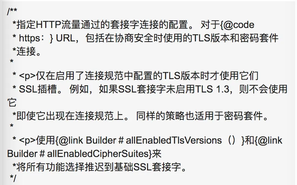ConnectionSpec: 指定HTTP流量通过的套接字连接的配置。我们直接可以翻译该类头部的英文介绍,具体的内容原谅我也不是很懂: