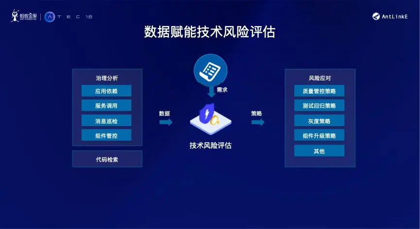毫无疑问,开发事前的技术风险评估是非常重要的。蚂蚁的技术风险评估主要基于两大输入来做:第一是需求输入,第二是治理分析相关数据输入和赋能,后者对我们来说更为重要。开发同学可以非常便捷地获取应用依赖、服务调用、消息巡检、组件管控、代码检索等数据,全面准确地评估变更带来的技术风险,基于这些数据和分析,就轻而易举地确定风险应对策略,做到有效的闭环的反馈。