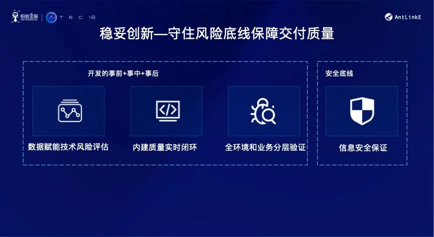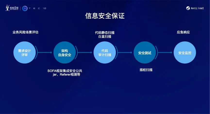 稳妥交付的最后部分,在保障信息安全方面,蚂蚁有一套完整的体系:在需求设计评审阶段,架构师会评估业务风险;在开发阶段,首先SOFA框架自身的安全是有保障的,其次每次代码提交我们都有安全的自动扫描,此外还会有专项的安全测试;最后在系统上线之后,我们有专门针对安全的监控和应急机制。