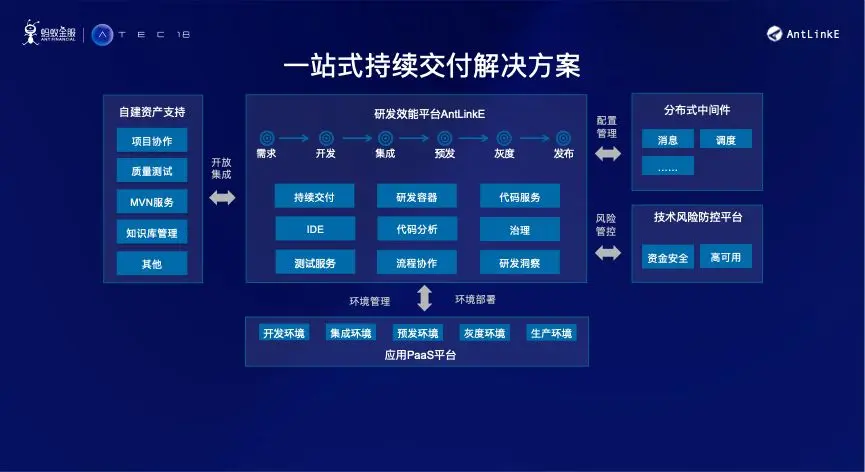 一站式持续交付解决方案如图所示。中间部分是研发效能平台,提供了从需求到发布的持续交付引擎,将所有相关的能力和工具串接在一起;底部是应用PAAS平台,效能平台通过openAPI与之交互,打通环境管理和环境部署等功能;右侧是分布式中间件,研发效能平台通过研发容器,统一管理多环境的中间件配置,既实现环境间的隔离,又实现了环境间的自动转换和同步;此外研发效能平台与技术风险防控平台打通,把技术风险防控的措施落实在研发过程中;此外,蚂蚁研发效能平台先天具备开放集成能力,可以通过组件的方式对接企业自有的工具平台,最大化发挥既有资产的价值。