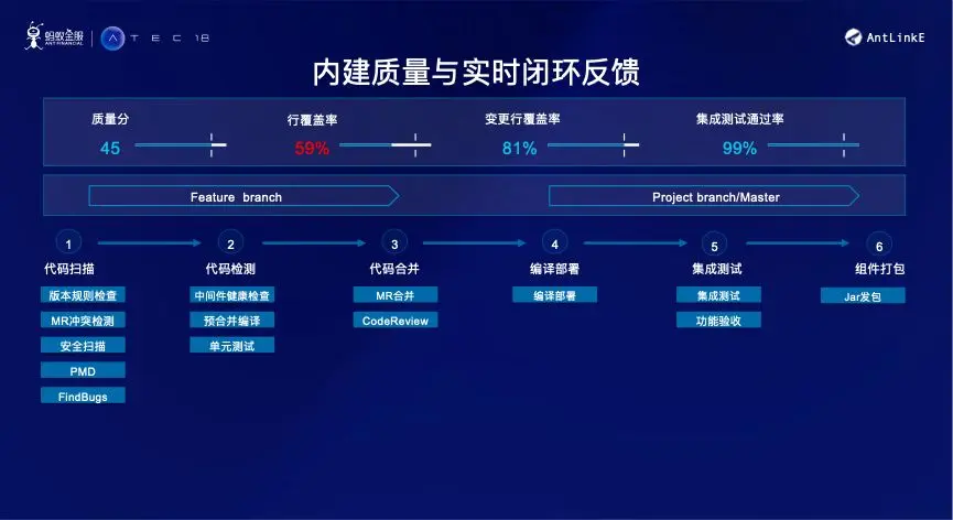开发的事中——内建质量与实时闭环反馈,帮助开发人员在第一时间把事情做对。在蚂蚁内部,我们鼓励基于gitflow的最佳实践,通过MergeRequest方式而不是Push方式向项目分支或主干提交代码, 给代码门禁、CI检测一个机会。事实上Pipeline流水线的所有节点和组件都是可编排、可扩展的。在提交代码之后,每执行完一个组件,平台都会实时反馈结果,并自动更新迭代的质量数据,协助开发测试同学管控质量风险。