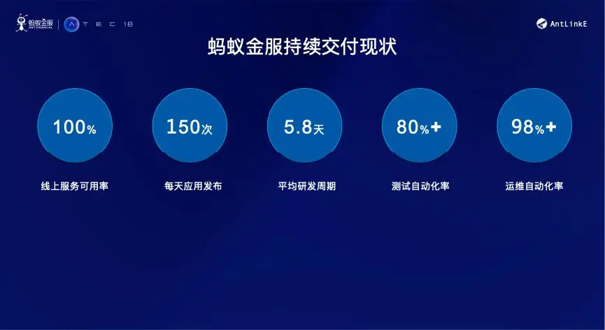 谈到“稳”和“快”,蚂蚁金服做得怎么样呢?分享上财年的几个实际数据:线上服务可用率——100%;每天应用发布超过150次;迭代平均研发周期5.8天;测试自动化率超过了80%;运维自动化率超过98%。