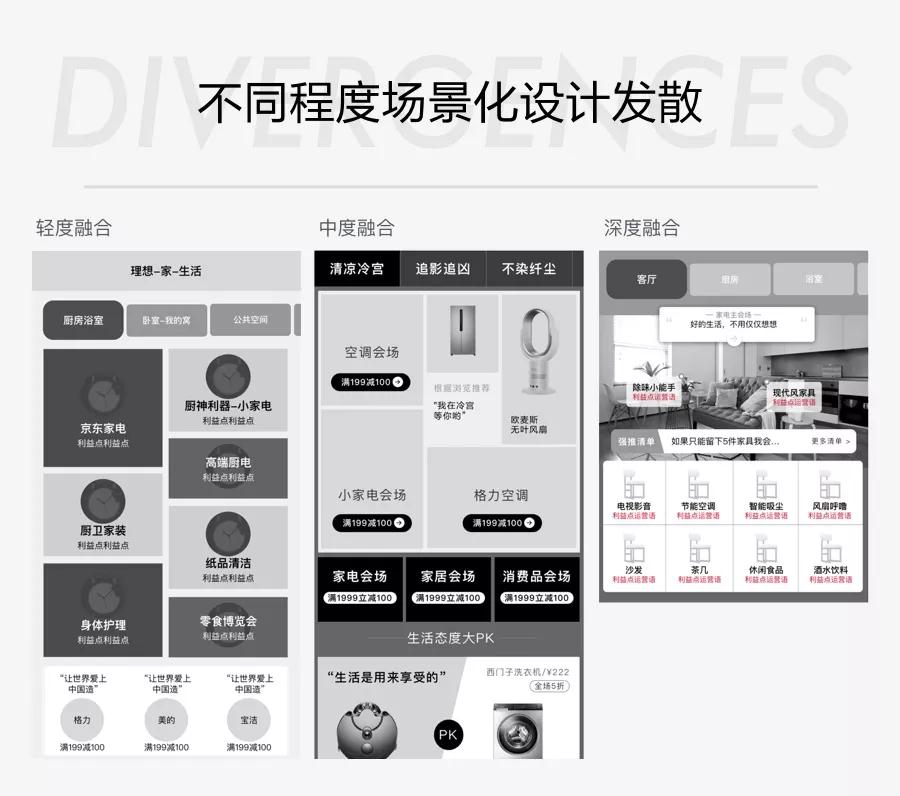 除此之外,结合主会场的分流属性,设计发散了3种不同程度的场景化落地方法:轻度场景化,中度场景化和重度场景化。通过这些维度来探索可能的结合方式。
