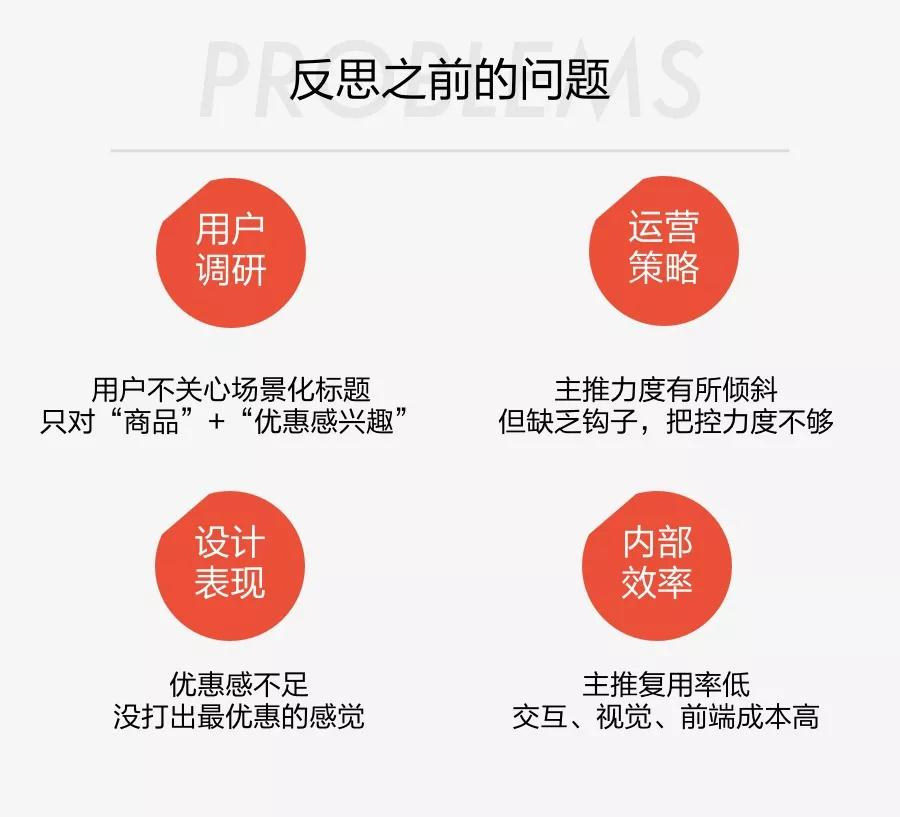 用户关注的是“商品”+“优惠”,运营也希望提供“今日优惠活动”促进成交,2者并不矛盾。但实践中发现,利益点实质上很吸引,但描述文案一般,同时设计并未对优惠信息重点凸显,导致“今天最优惠”的感觉并没有打出来。所以本次将“优惠最大化”策略作为核心策略之一,希望可以提升坑位的吸引力。运营也是基于该思路,在选品上做了相当大的把控和力度倾斜。