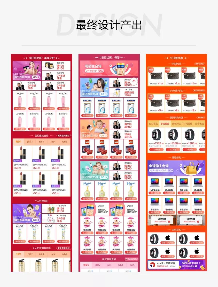 在楼层贯穿中,回归用户本身的购物场景,避免过度包装,也避免过于生硬的将内容包装在一起。比如今天推母婴,可以将奶粉&辅食聚合起来,童装&童鞋聚合起来,就像在超市一样,给用户一个标示,这样可以快速识别当前的场景,提高浏览效率。