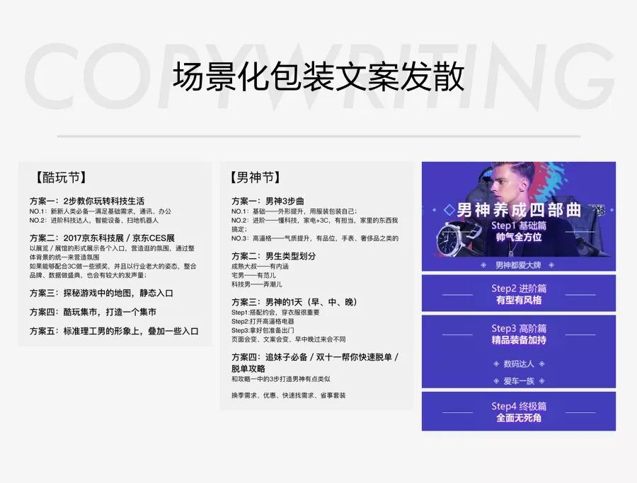 经过了上面的发散,需要对最后的落地策略进行收敛,这就要回归京东主会场的核心目的——高效分发流量。主会场资源寸土寸金,基本不太可能在楼层中花太多的空间去打造“场景化”氛围,所以最后确定采用轻度场景化方向,配合文案包装,将主推内容贯穿起来。