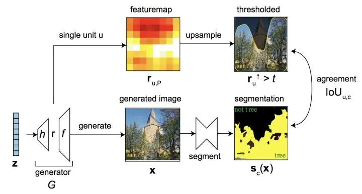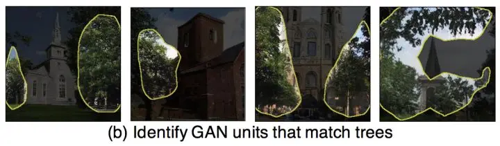 首先,把跟某个物体 (比如树) 相关的、可解释的GAN单元 (Interpretable GAN Units) 挑出来。通俗说来就是根据特征图 (Feature Map) ,找到哪些神经元对应哪个物体。