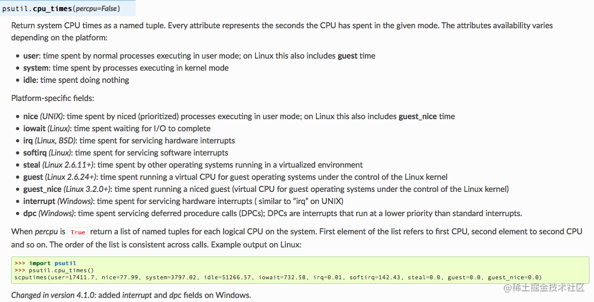 复制代码cpu_times 中的参数有哪些含义呢?文档中也给出了具体的释义