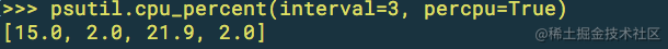 复制代码往下看还可以看到其他的 cpu 监控模块,比如我们最需要的 cpu 资源消耗百分比,cpu_percent(interval=None, percpu=False) 可以返回一个浮点数,表示当前系统范围的CPU利用率百分比。当interval为> 0.0比较间隔之前和之后经过的系统CPU时间(阻塞)。当interval是0.0或None比较自上次调用或模块导入后经过的系统CPU时间,立即返回。这意味着第一次调用它将返回一个无意义的0.0 值,你应该忽略它。在这种情况下,建议0.1在调用之间至少调用此函数的准确性。当percpu是True返回表示利用率的浮点数列表,以每个CPU的百分比表示。列表的第一个元素是指第一个CPU,第二个元素是第二个CPU,依此类推。列表的顺序在调用之间是一致的。
