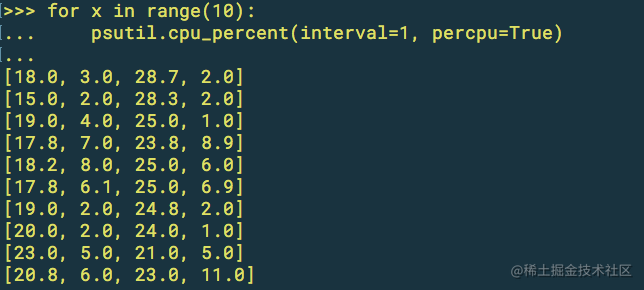 如果我们希望得到类似于 top 命令的使用率排行,那我们应该如何做呢?鉴于前面学习的 cpu_percent 我们来尝试一下: