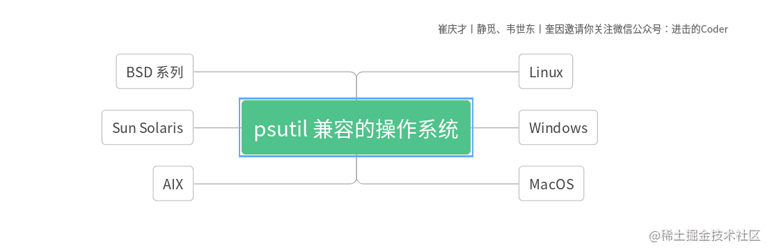 psutil 实现了UNIX命令行工具提供的许多功能,比如 top、free、netstat、kill 等,并且还兼容各大操作系统:
