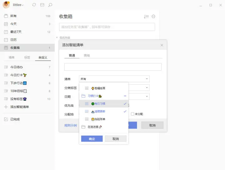 可筛选单个或者多个清单,这个用法可以用于从属清单夹下的两个清单任务合并显示。