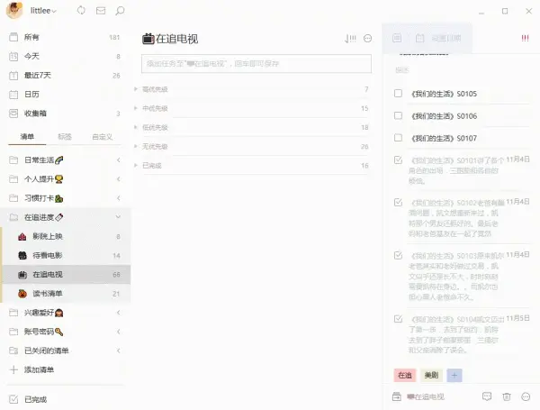 进度分别对应优先级的四项选择,而剧种更显而易见,就是对应剧种的意思。以优先级剧种标签为筛选,你就能知道你追剧的进度了。同理也可以创建读书清单。