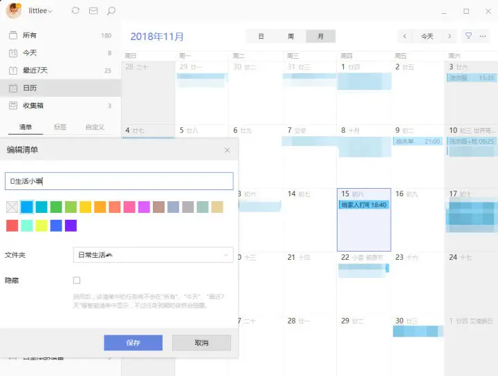 滴答的清单是可以选择颜色的。为什么要选择颜色呢?因为在清单颜色选择之后,就会在日历上显示,不但美观也能简介告诉任务是大致用来做什么的。滴答现在一共有 19 种颜色,所以选择还是很多的。